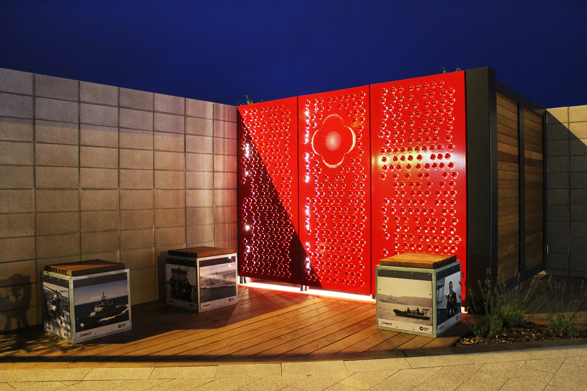 The layout allows for spatial diversity, with raised planters, bespoke seating, and paving. Areas of timber decking provide textural interest and colour. Key elements include the feature lighting red poppy panels, cube seats featuring contemporary NZ Navy photographs, and a water feature dedicated to Passchendaele.